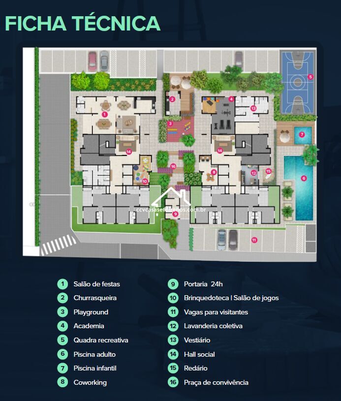 Academia de ginásticaBicicletárioChurrasqueiraLavanderiaPiscina adultoPiscina infantilPortariaPraça de ConvivenciaQuadra poliesportivaSala de jogoscoworking